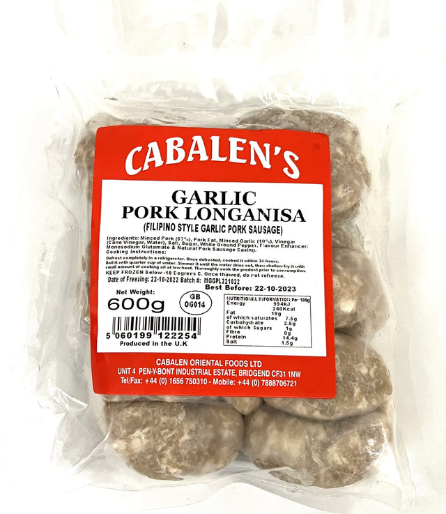 Indulge in the rich and savory goodness of Filipino cuisine with Frozen CABALEN'S Garlic Pork Longanisa. Expertly crafted with premium pork, aromatic garlic, and a symphony of spices, these sausages offer a delicious blend of flavors that captures the essence of traditional Filipino longanisa. Conveniently frozen for freshness, bring the taste of the Philippines to your table with every bite.