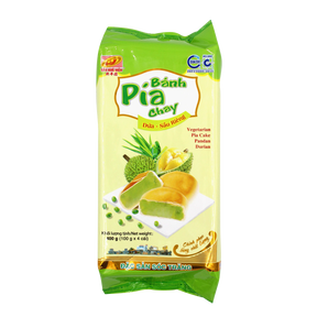 Mung Beans & Pandan Leaf Vegetarian Pia Cake (Banh Pia) is a specialty of Soc Trang (Vietnam). This Mung Beans & Pandan Leaf Vegetarian Pia Cakes have a special taste with an aroma of durian fruit, the unique flavour of Pandan Leaf.